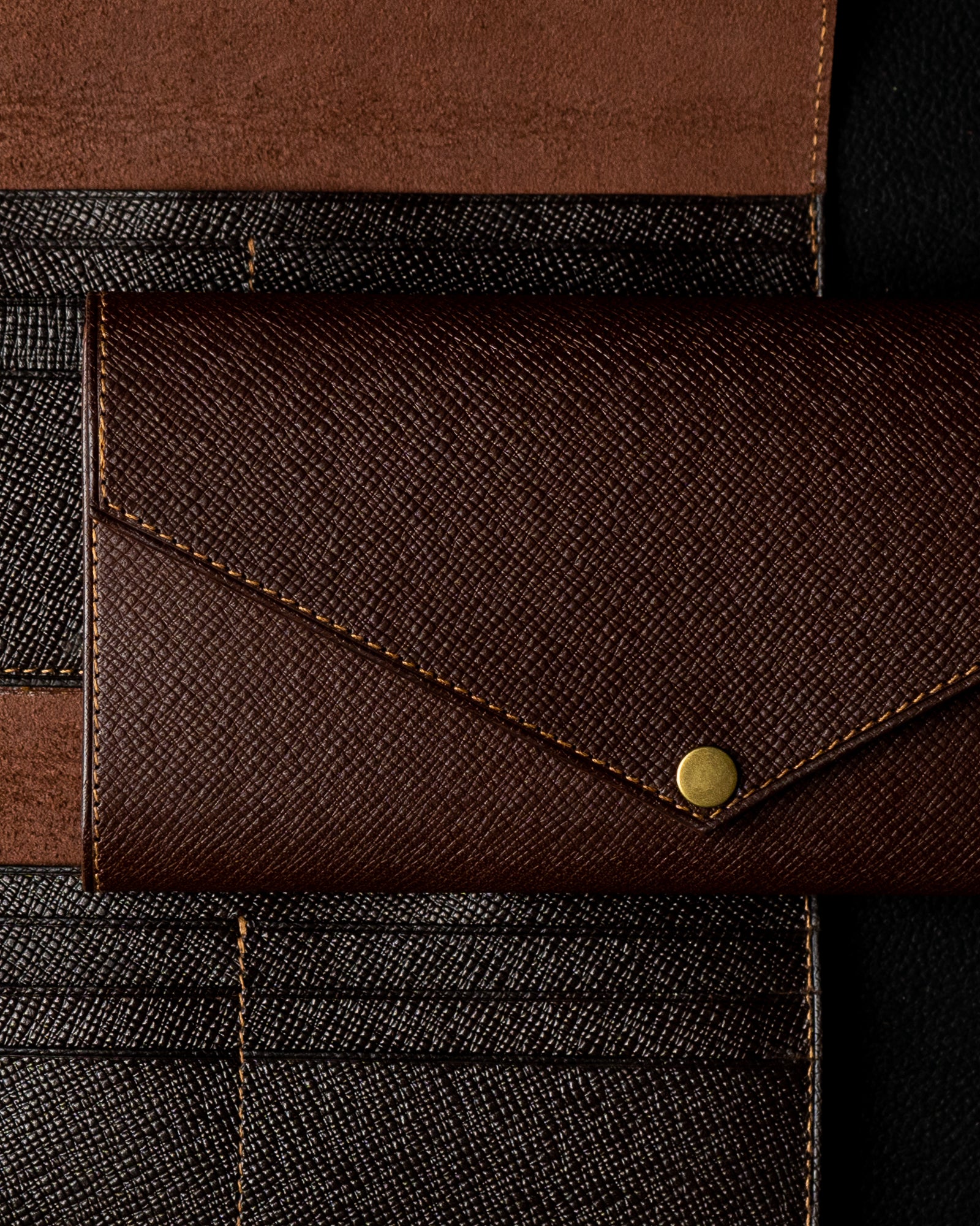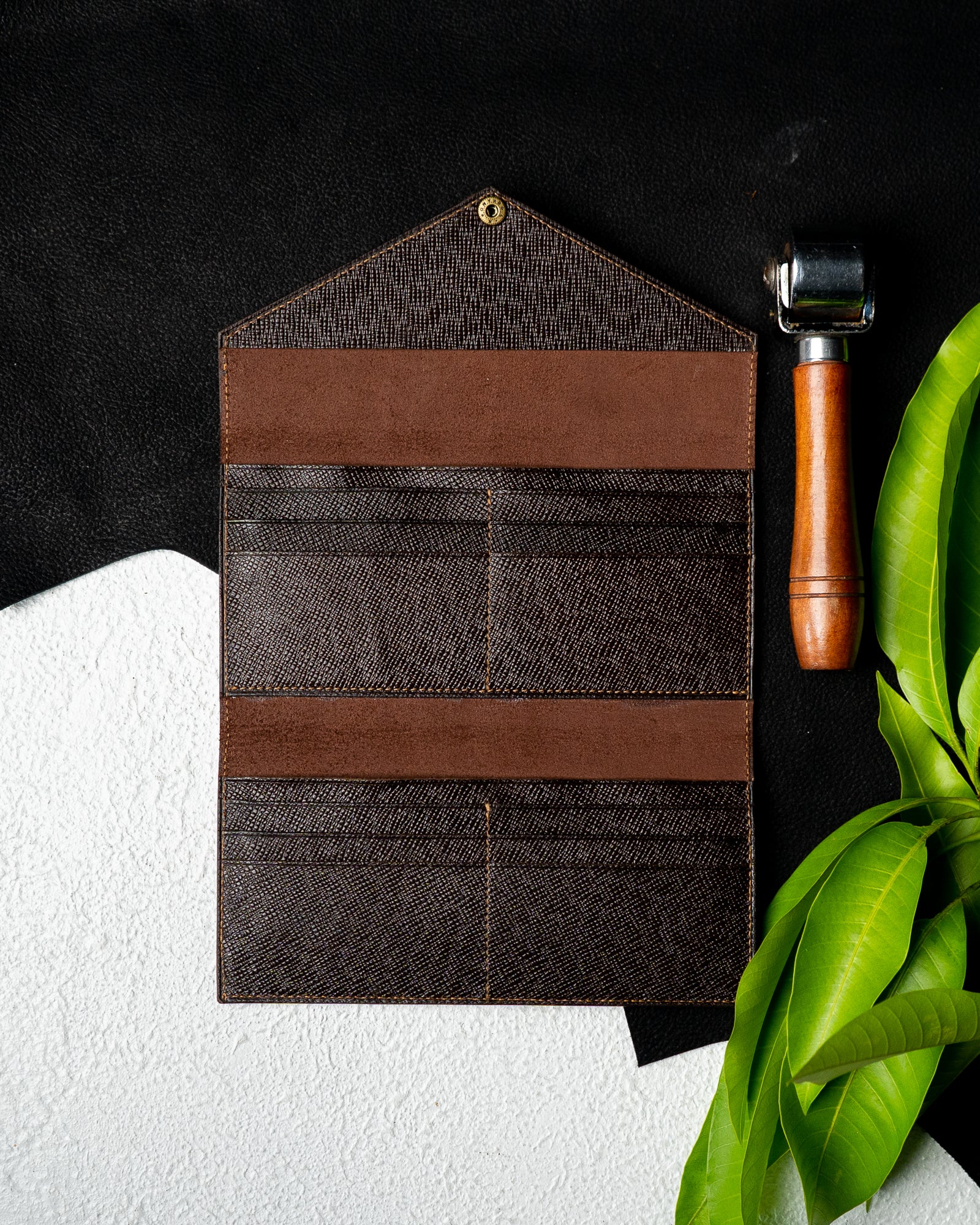 Elegant. Structured. Timeless. The EZRA Wallet is designed for women who appreciate a slim yet practical wallet with a refined look. This edition is crafted with premium dark brown saffiano full-vegetable tanned leather, giving the wallet a beautiful cross-grain texture and a sophisticated finish.